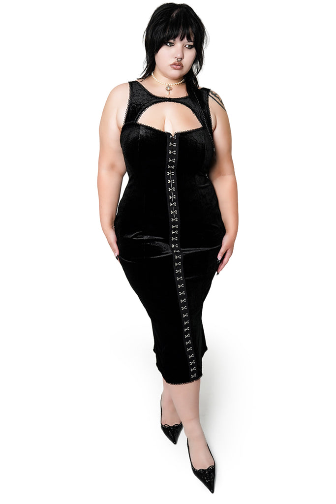 Based on our bestselling Moonspell Top, our newest version features the same stretch velvet construction, picot trim details, and hook and eyes but in a sensual midi length cut.