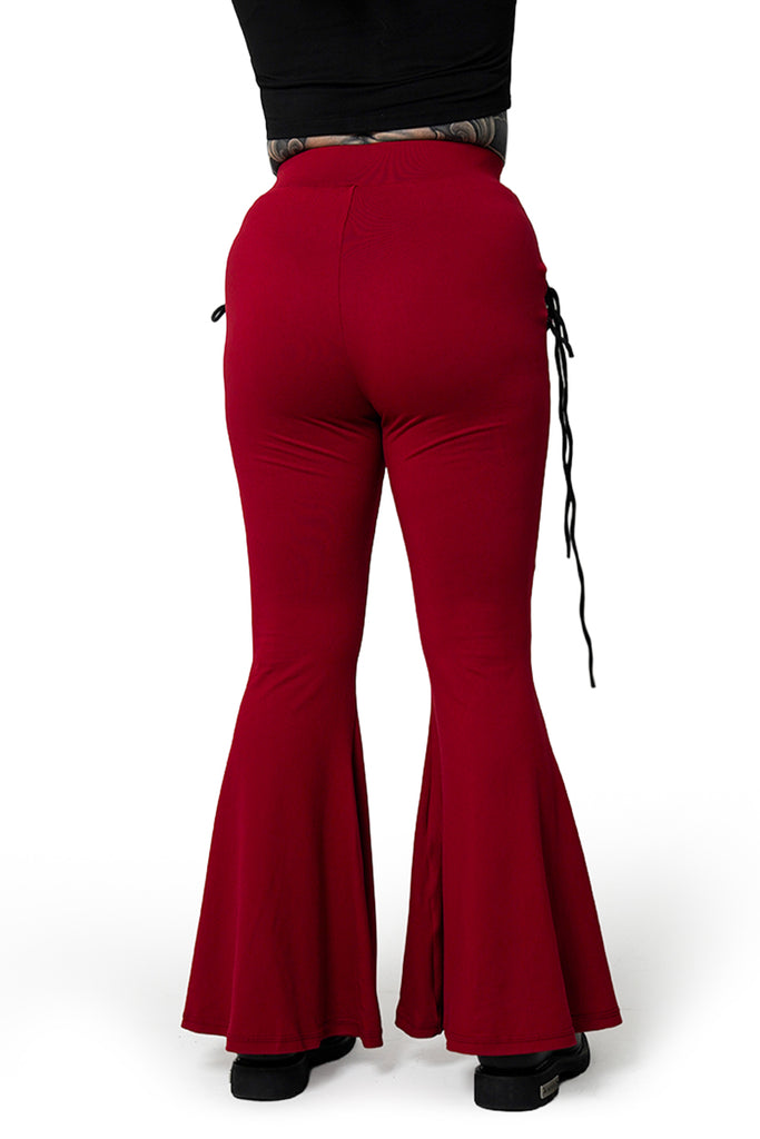 Our bestselling Alice Flare Pants have arrived in our first new color: blood red! Featuring the same signature stretch fabric, reinforced eyelets and corset detailing, and dramatic flare as the original, the new style comes in a bold new red with contrasting black strings.