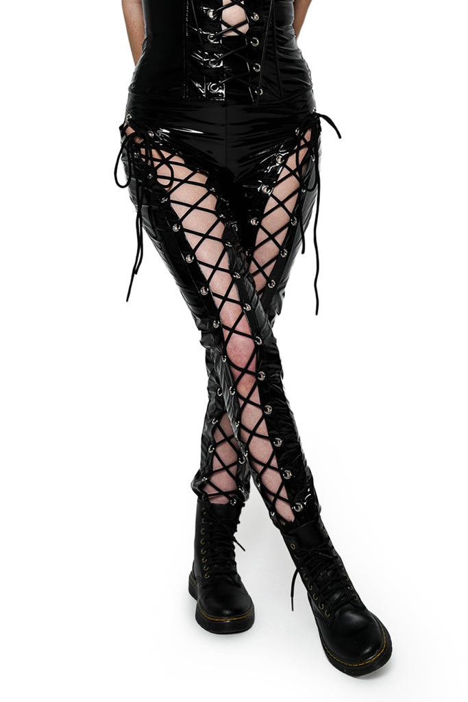 Our newest take on our classic Alice style has arrived with the Enigma PVC Leggings. Made of our newest stretch PVC, these leggings feature adjustable lace ups on the legs and an ultra tight fit. Pair with the Enigma PVC Corset for the perfect matching look for goth clubs and nights out.