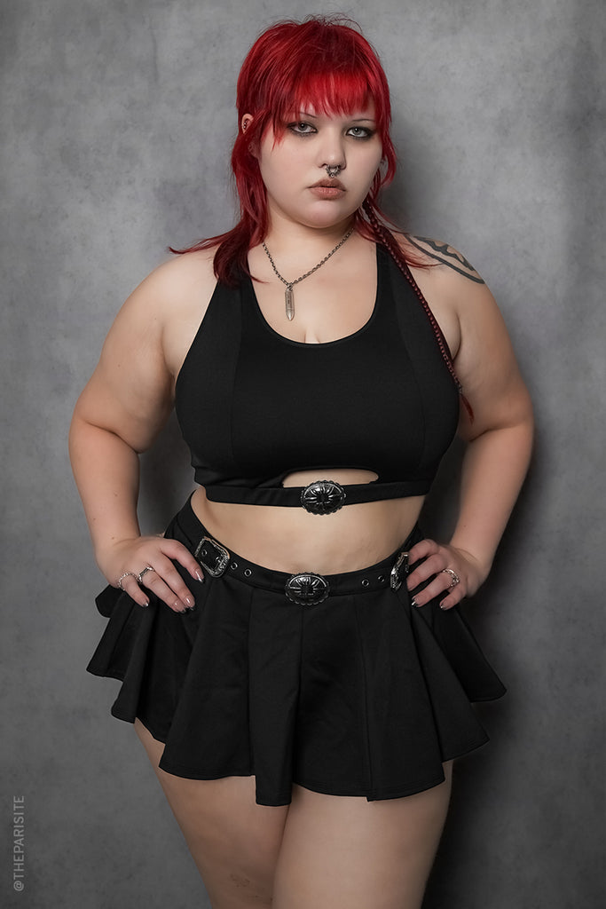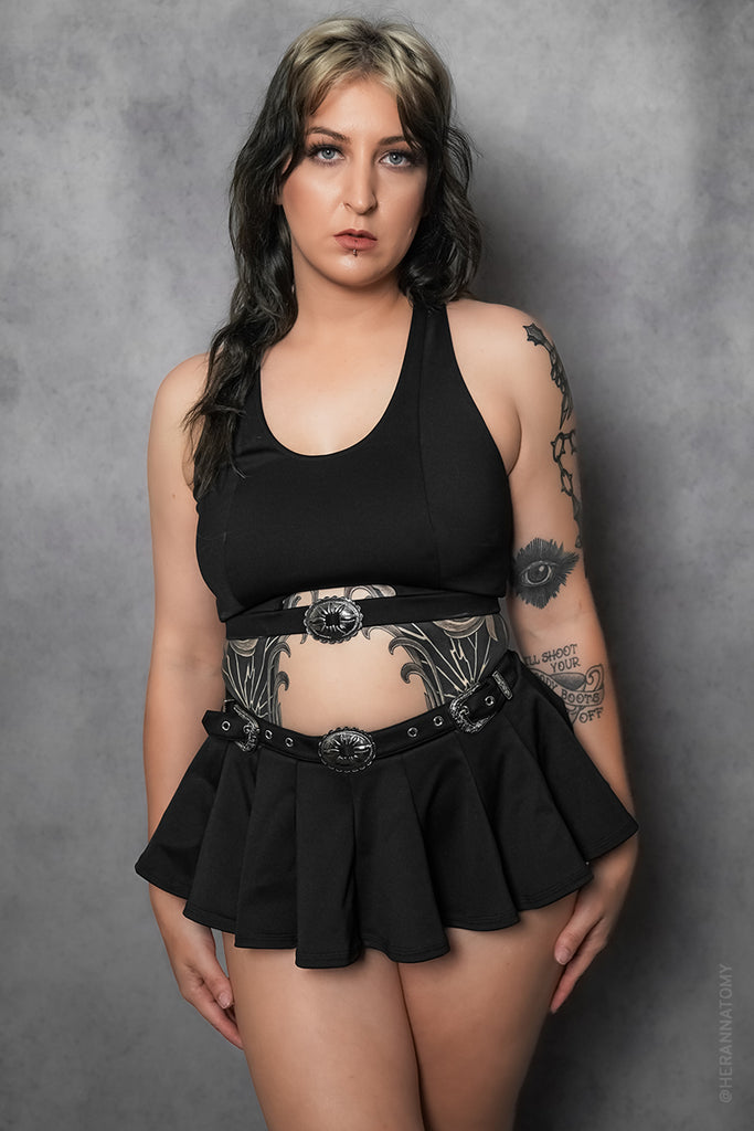 Dare to be wild with the new Daredevil Bikini Top! This bikini top is built for high support, with adjustable racerback straps, ample bust space, and a lower cutout that features concho details. Pair with the Daredevil Swim Skirt for the perfect matching set.